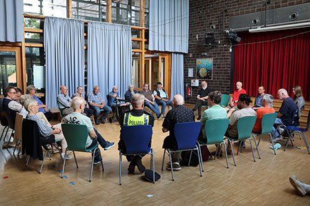 Bei unserem Politischen Stammtisch am 3.7.2025 ging es dieses mal darum, mit Bewohnerinnen und Bewohnern Ideen zu sammeln, was wir gemeinsam mit den Politikerinnen und Politikern unternehmen können, um das Gemeinschaftsleben von älteren Menschen in Boberg zu verbessern. Passend zum Thema wollten wir uns im Foyer der AWO-Seniorenwohnanlage im Boberger Anger treffen. Kurzfristig (um 13 Uhr) hat uns die Bereichsleiterin der AWO per Mail mitgeteilt, dass uns die Räume der AWO nicht zur Verfügung gestellt werden können. Unser Cheforganisator Andreas Müller hat zum Glück schnell einen Ersatz gefunden. Dank der unkomplizierten Unterstützung durch die Schulleiterin Anne Keding konnten wir in die Aula der Grundschule Heidhorst ausweichen.