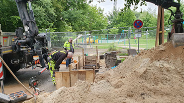 Für das im Bau befindliche CLIPPO Boberg müssen neue Leitungen an das vorhandene Wasser- und Sielnetz angeschlossen werden. Siele hierfür wurden bereits im Februar im vorderen Bereich des Spielplatzes angelegt (zurzeit durch einen Bauzaun abgegrenzt), nun geht es um den Anschluss unterhalb des Straßenbelages.