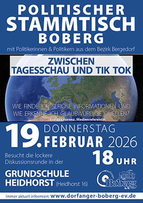 Mit unserer Veranstaltung Politischer Stammtisch Boberg waren wir am 20.2. in der Aula der Grundschule Heidhorst zu Gast. Bei dem Thema „Boberg vor der Wahl, Erwartungen an die Demokratie“ ging es ausnahmsweise mal nicht um lokale Themen aus Boberg und Umgebung. Und auch auf das bisherige Format vor den Wahlen mit einer Podiumsdiskussion mit den Bergedorfer Kandidaten haben wir bewusst verzichtet.