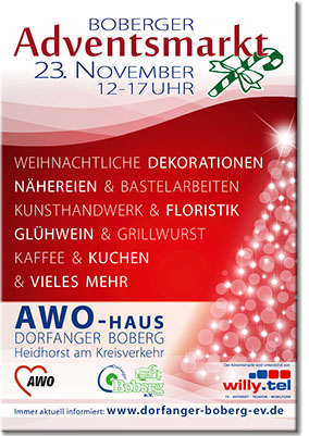 Alles, was mit dem Advent und Weihnachten zu tun hat: Kunsthandwerk, Blumen, Gestecke, Gebasteltes, Gemaltes, Speisen und Getränke. Im großen Foyer der Service-Wohnanlage und der dazugehörigen Terrasse beim Kreisverkehr der Straße Heidhorst. Unterstützt vom Dorfanger Boberg e.V.
