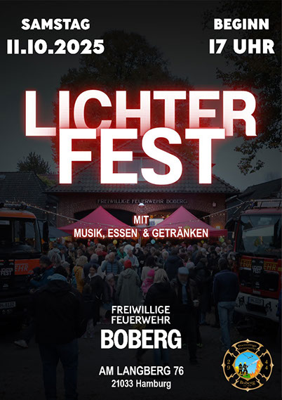 In diesem Jahr feiert die FF Boberg erneut ein Lichterfest. Für das leibliche Wohl ist gesorgt, ab 17 Uhr gibt es Stockbrot, Waffeln, Würstchen sowie Bier, Glühwein und Softgetränke. Wir freuen uns auf ein gemütliches Beisammensein.