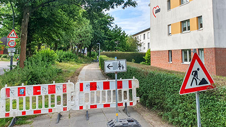 Wieder einmal tut sich dank unseres politischen Stammtisches etwas. Bei einem verkehrspolitischen Rundgang im vergangenen Jahr wurde von Bewohnern der AWO-Servicewohnanlage der schmale Gehweg vom Kreisverkehr Richtung Netto bemängelt. Immer wieder kam es vor, dass Radfahrer unerlaubterweise den Gehweg benutzen und speziell Personen mit Rollator in Bedrängnis brachten. Die Ortsbegehung hatte ergeben, dass der zur Straße hin befindliche Grünstreifen genug Platz für eine Verbreiterung bietet. Diese Maßnahme wird aktuell umgesetzt und der Gehweg von 1,5 auf 2 Meter verbreitert. Herzlichen Dank an Herrn Charles, dem Leiter vom "Fachamt Management des öffentlichen Raumes" in Bergedorf, der dies ermöglicht hat.