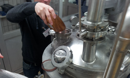 Nach dem der Braumeister die Rezeptur zusammengestellt hatte ging es auch gleich los mit dem Brauen. Als erstes mussten durch die Teilnehmer 12,5 Kg Braumalz aus fünf verschiedenen Sorten zusammengestellt werden. Alles zusammen in die Schrotmühle und das Brauen begann. Das gemahlene Schrot kam in die Maischpfanne und musste erstmal 2,5 Stunden einmaischen (sogenanntes Rasten). Nach dem Maischen wurde der Sud in den Loiterbottich gepumpt.