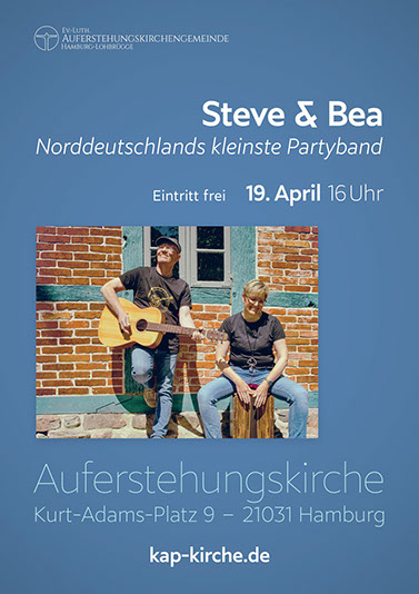 Ein Mann, eine Frau, zwölf Saiten und ein Cajon: Steve & Bea bringen Stimmung in die Bude. Mit einer wilden Mischung aus Rock, Pop, Schlagern und Oldies spielen sie sich quer durch sechs Jahrzehnte Musikgeschichte. Hier kommt nichts vom Band: Alles ist 100% handgemacht, ohne Loops und Tricks. Dazu gibt es eine ordentliche Portion Hamburger Schnauze und spontane Interaktion mit dem Publikum. Ob auf AIDAKreuzfahrten oder norddeutschen Stadtfesten: die beiden wissen, wie man gute Laune verbreitet.